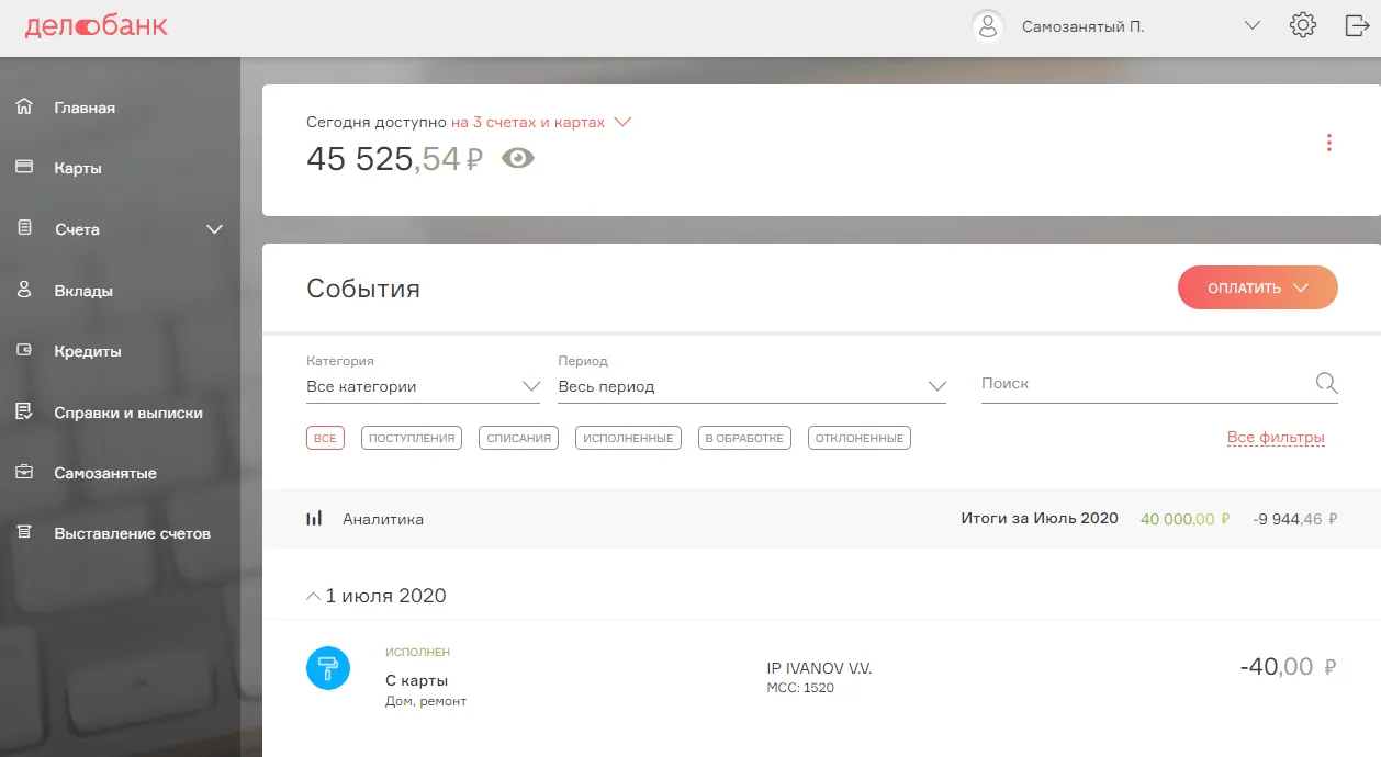 Чтобы воспользоваться сервисами, нужно иметь расчётный счёт в «Делобанке» или «СКБ-банке». Если захотите открыть счёт в «Делобанке», сделать это можно вот по этой ссылке. Нет, это просто ссылка, она ни к чему не обязывает. Да, открывать не обязательно, но тогда зарегистрироваться самозанятым через банк не получится.
